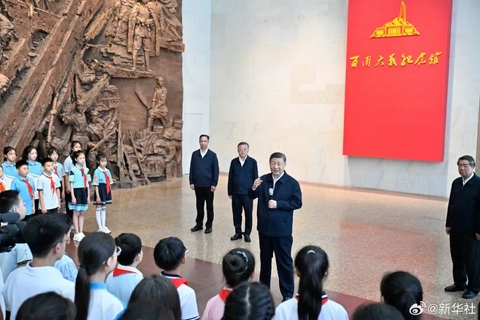 7日下午,習(xí)近平總書(shū)記來(lái)到山西省陽(yáng)泉市,向百團(tuán)大戰(zhàn)烈士敬獻(xiàn)花籃,參觀百團(tuán)大戰(zhàn)紀(jì)念館。在紀(jì)念館大廳,習(xí)近平同青少年學(xué)生和紀(jì)念館工作人員親切交流。他對(duì)大家說(shuō),今天來(lái)到這里有特殊意義。七七事變是全民族抗戰(zhàn)的開(kāi)始,中國(guó)共產(chǎn)黨是全民族抗戰(zhàn)的中流砥柱,百團(tuán)大戰(zhàn)讓全世界看到了中國(guó)共產(chǎn)黨和中國(guó)人民抗戰(zhàn)的意志和力量。我們堅(jiān)持14年抗戰(zhàn),作出了巨大犧牲。前事不忘,后事之師。孩子們要爭(zhēng)做民族的脊梁,一定要把我們國(guó)家建得強(qiáng)盛起來(lái),要為全世界的和平作貢獻(xiàn)。希望寄托在你們身上,未來(lái)是屬于你們的。希望你們好好努力、奮發(fā)圖強(qiáng),做一個(gè)堂堂正正、光榮自豪的中國(guó)人。